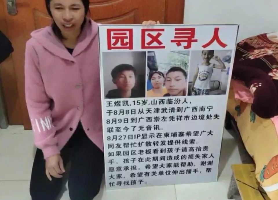 11月9日,有网友在腾讯热问发帖求助,称他15岁的儿子王煜凯8月8日坐飞机去了广西南宁,第二天便在广西凭祥市边境失联,近20天后儿子的社交平台账号定位显示在柬埔寨,此外再也没有其他任何消息,其间有疑似园区工作人员用王煜凯的社交平台账号告诉他:“弄3个人过来,你儿子就能回去。”