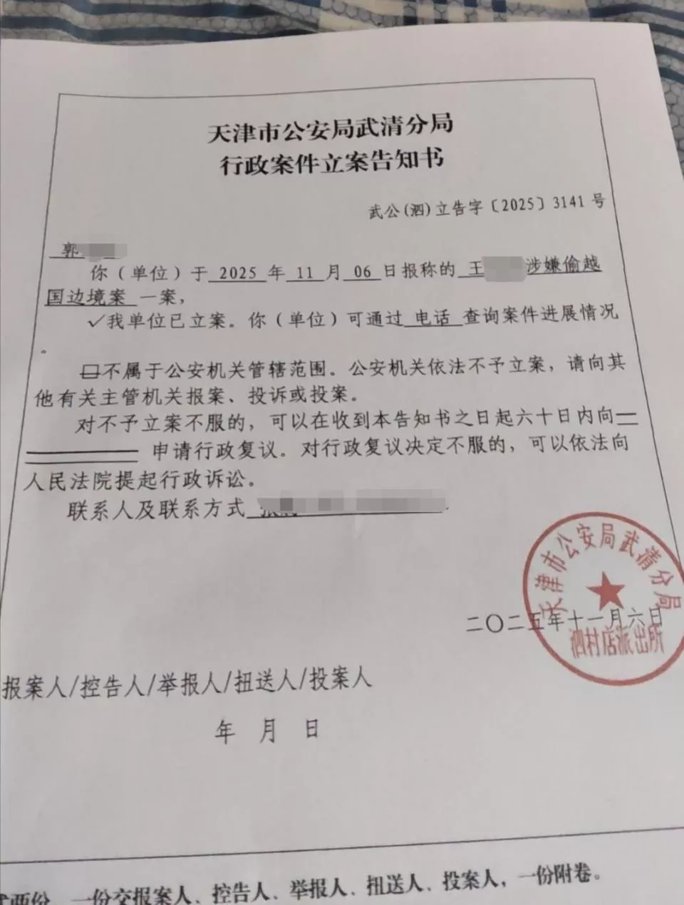 据郭先生提供的行政案件立案告知书显示,天津市公安局武清分局已将王某某涉嫌偷越国边境案立案,落款时间为2025年11月6日,盖章单位为天津市公安局武清分局泗村店派出所。