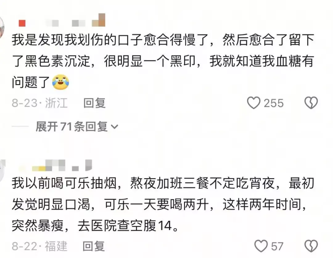 评论区里还有很多病友晒出发现自己患病的征兆:有人是发现身体划伤口子后愈合得慢了,且会留下黑色素沉淀,以此推断血糖有问题……