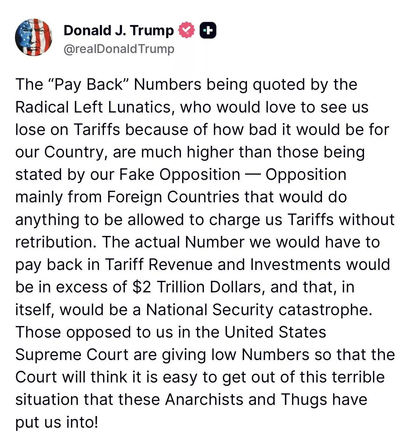 他后来又发贴文,强调若关税被裁定无效,美国需要偿还的金额远高于法院反对关税的一方提出的数字:“我们实际需要在关税收入和投资方面偿还的金额将超过2万亿美元,这本身就将是一场国家安全灾难。”