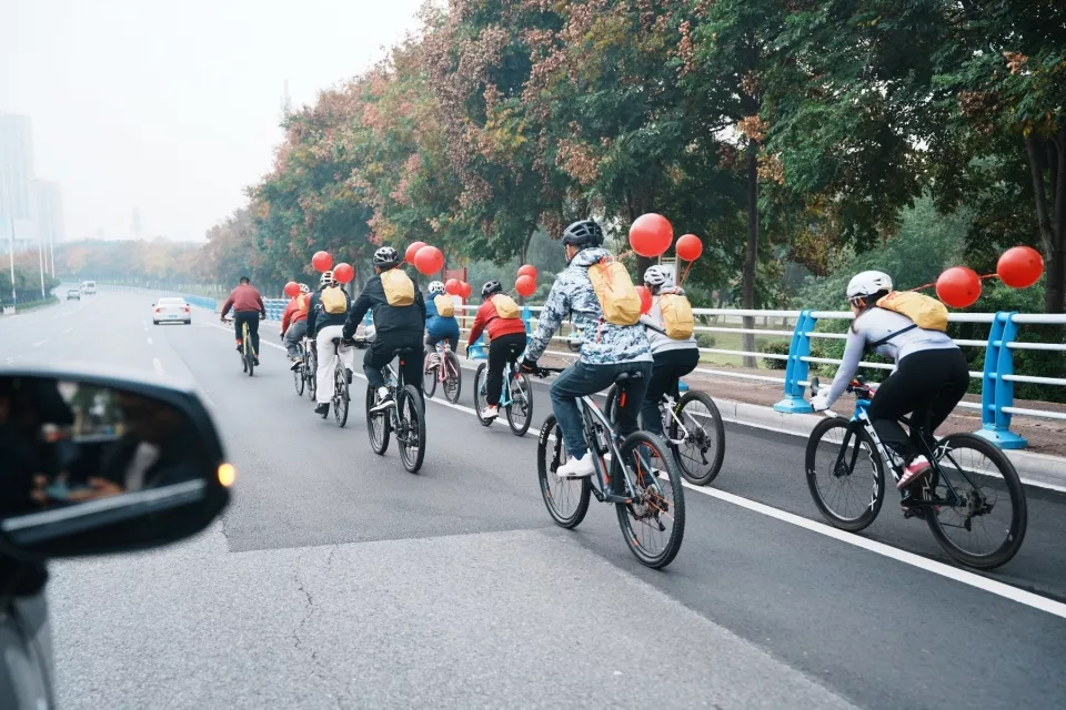 婚礼于11月1日举行,接亲队伍由两人熟识的骑友组成,大家身着运动服,骑着各自的山地车。统一的背包上系着的红气球随风轻扬。新郎新娘在队伍最前方领骑,其“主婚车”装点着鲜艳扎花,整支队伍在街道上格外醒目。