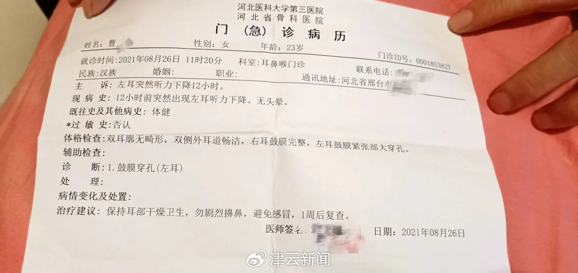曹依父亲提供的一份2021年8月的病历显示,曹依左耳听力突然下降12小时,被诊断为鼓膜穿孔。曹父称,这是被刘毅掌掴所致,事发后他们本想报警,但女婿下跪认错,女儿也担心案底会影响孩子,最终原谅了对方。而刘毅的三姨则称(一审判决书中显示),曹依的耳伤是在其抓挠刘毅的过程中,刘毅用胳膊挡时不小心导致。