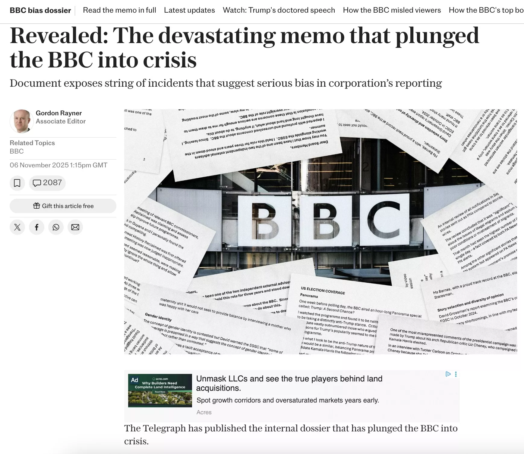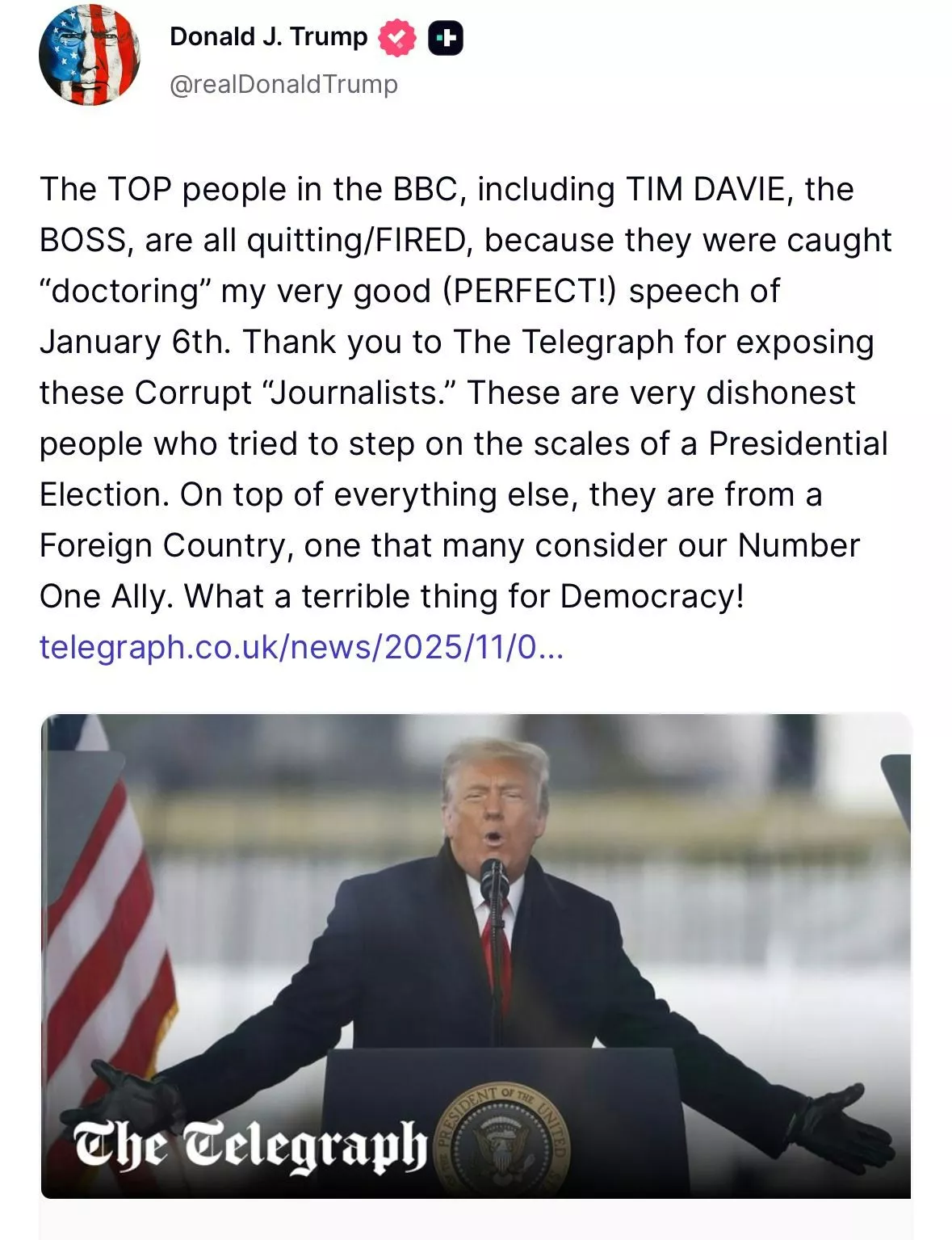 11月9日,特朗普在社交媒体写道:“BBC高层,包括其老板戴维在内,都辞职/被解雇了,因为他们被发现篡改了我1月6日那篇精彩绝伦(完美!)的演讲稿。感谢《每日电讯报》揭露了这些腐败的『记者』。”(Truth Social)