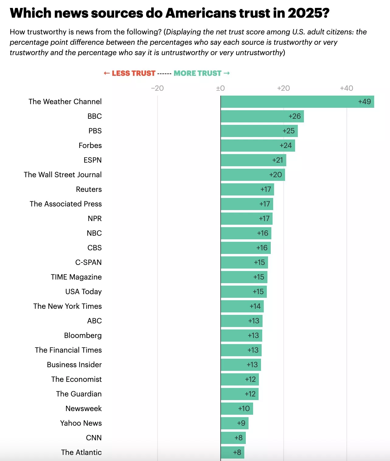 根据2025年9月的数据,BBC是美国访客量排行第八的新闻网站,月访客量达1.18亿,是前十名中唯一一个外国新闻机构。而且,根据YouGov的数字,BBC在美国的公信力仅次于“天气频道”(The Weather Channel),远胜《纽约时报》、CNN等美国自由派媒体。