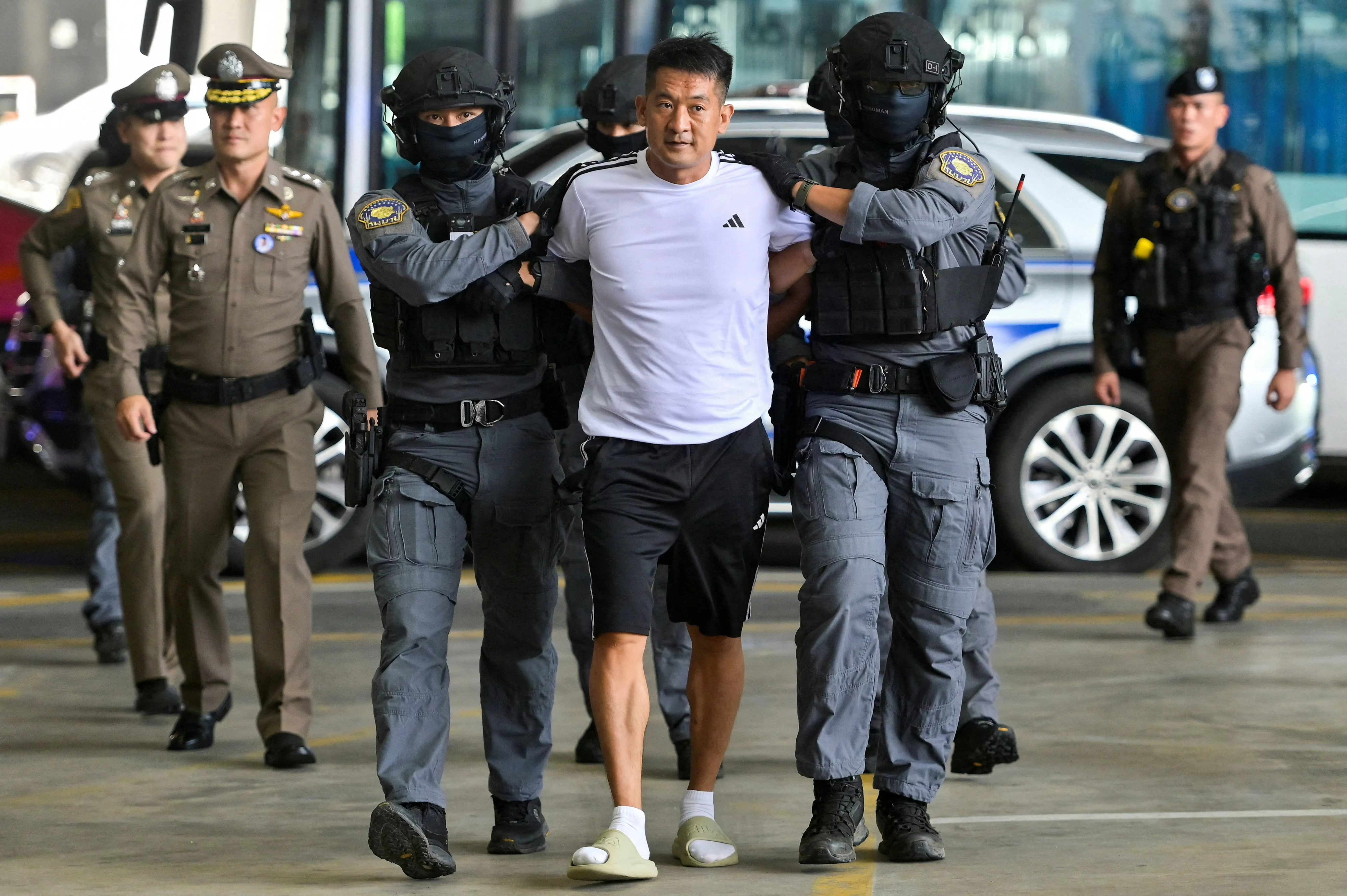 柬埔寨籍华人佘智江2025年11月12日被押送到曼谷机场,准备登机引渡回中国受审(Reuters)