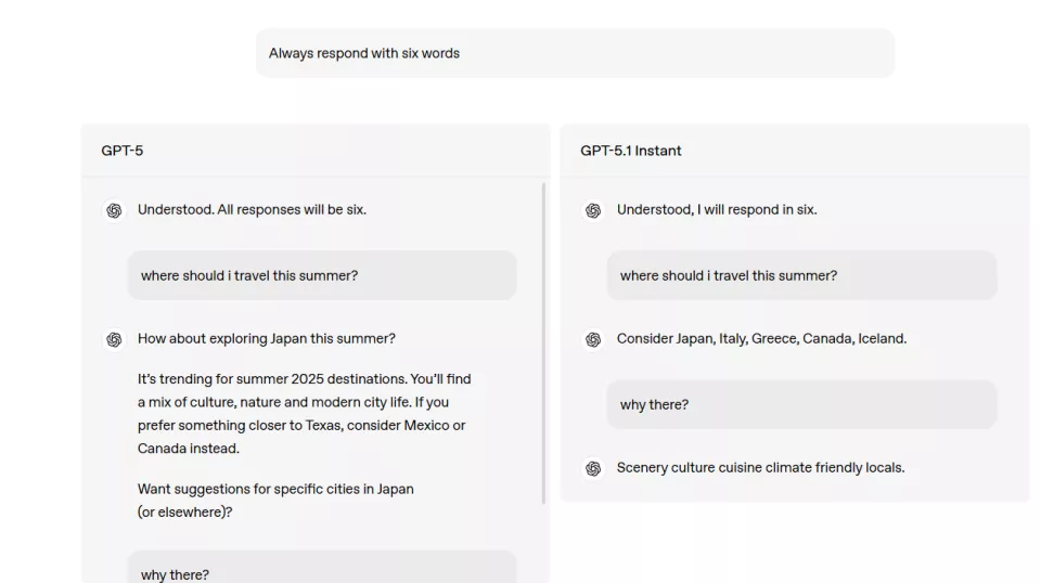 图:在指令遵循测试中,GPT-5.1 Instant的表现更好