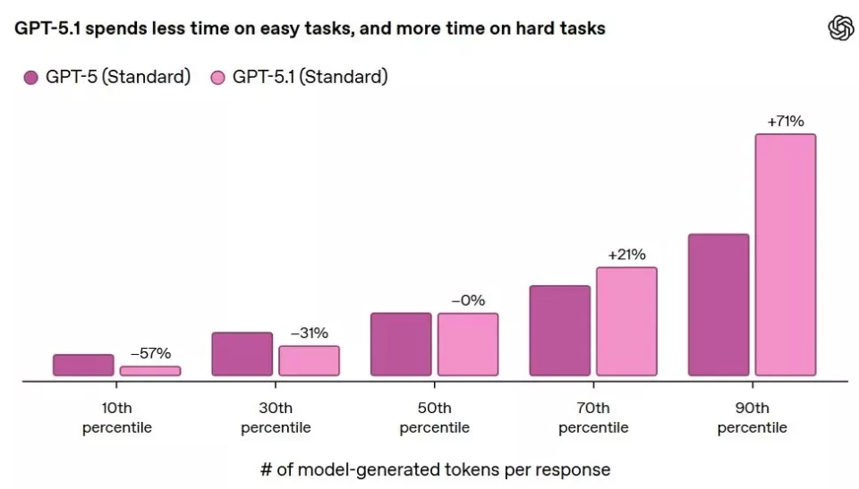 值得关注的是,GPT-5.1 Thinking的思考节奏比前代产品更加灵活。在处理各类ChatGPT任务时,它在简单任务上的响应速度提升约两倍,而在复杂任务上则会投入更多思考时间,真正做到"当快则快,当慢则慢"。