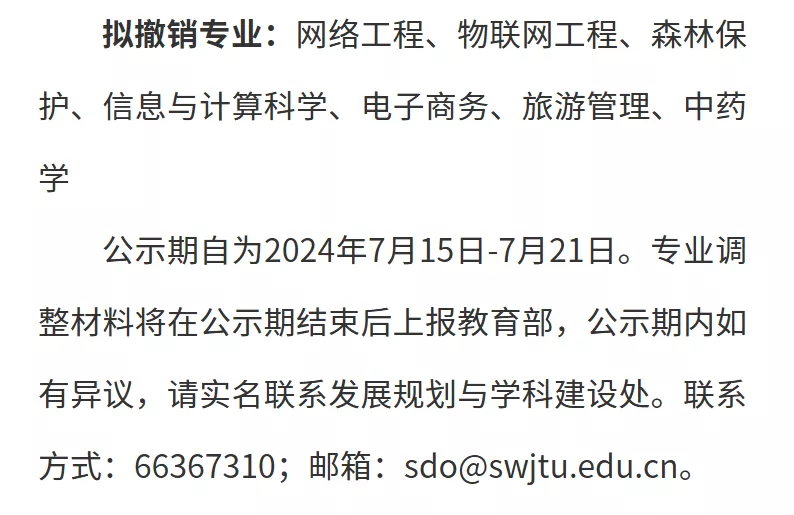 2024年7月,西南交通大学发布拟调整本科专业公示,拟撤销网络工程、物联网工程、信息与计算科学专业。