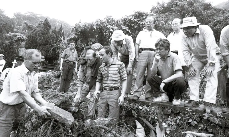 受难者发现六张犁烈士墓碑,右一为互助会总会长林书扬,右三蹲着的是陈映真,右四为张敏生
