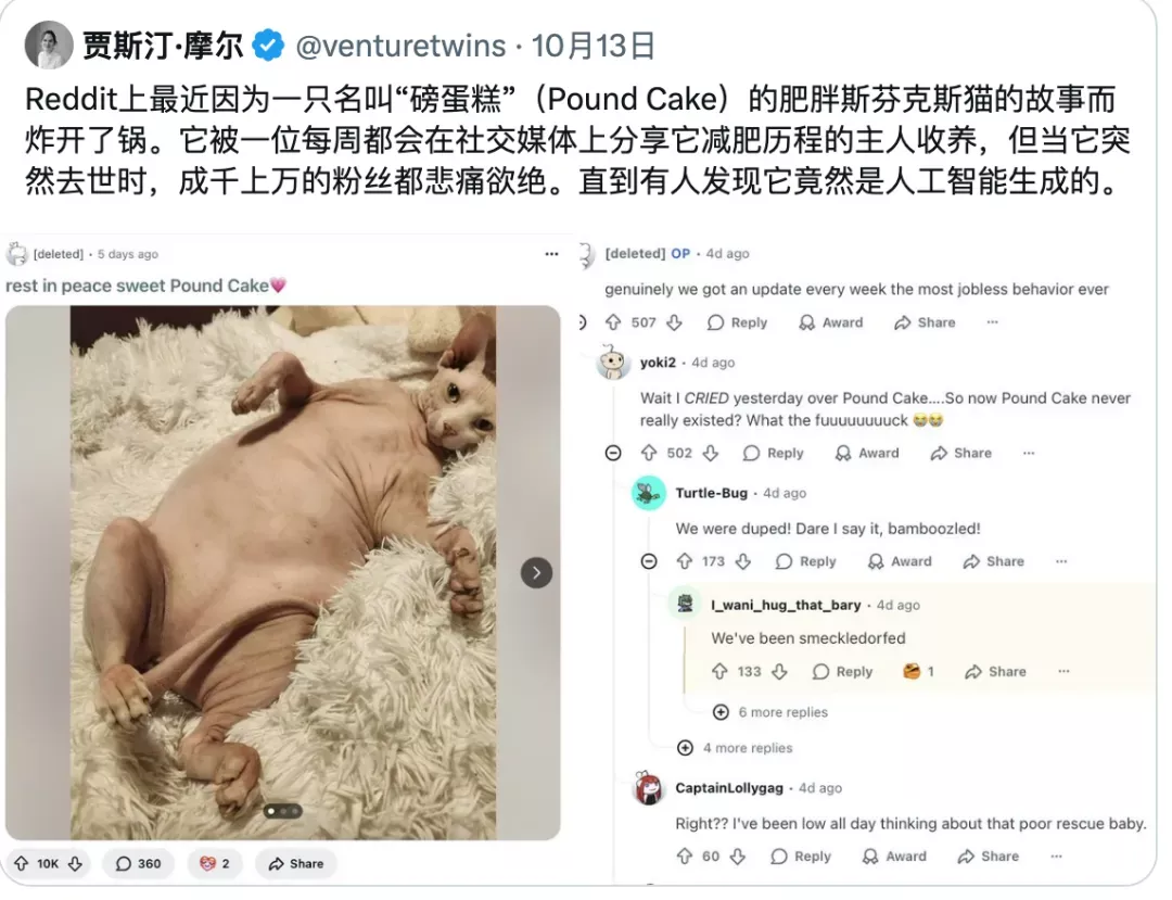 在Reddit上,有一只叫“磅蛋糕”肥猫,主人每周都带着它做各种减肥训练,磅蛋糕很快成了网红。当它突然去世时,数千万人前一秒还在网络祭奠,后一秒则发现——这只猫是人工智能合成的。成千上万粉丝的眼泪和同情,只是投进了一个赛博玩笑而已。