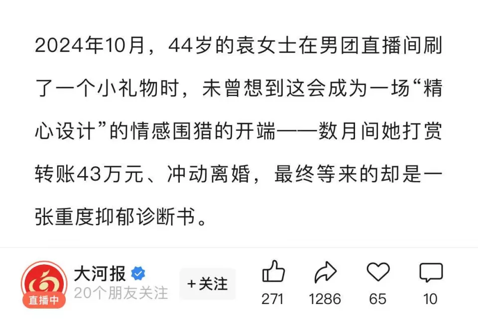 还有一位44岁的袁女士,为男团主播“X风”累计打赏转账43万元,不仅将X风捧成公司“榜一”,还为他冲动离婚。