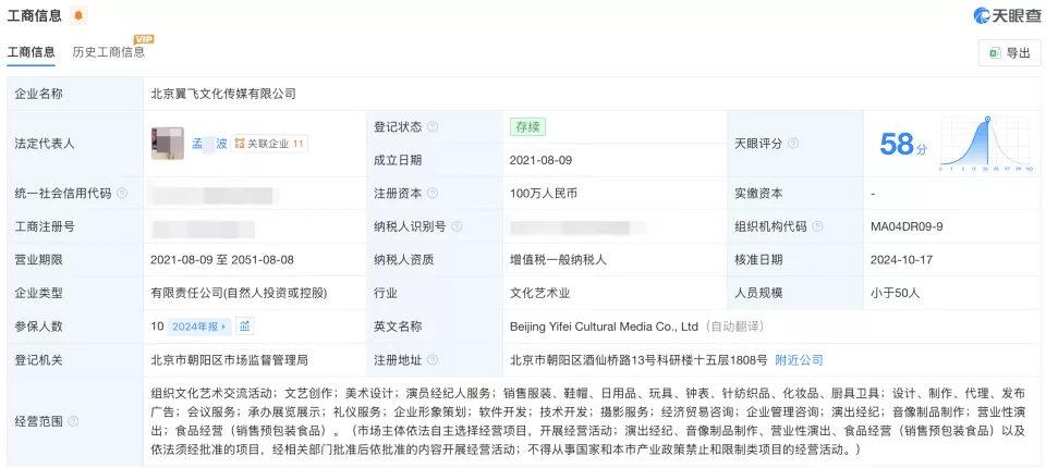 天眼查显示,【北京翼飞文化传媒有限公司】2021年8月成立,其经营范围包括组织文化艺术交流活动、文艺创作、演出经纪、营业性演出等等。