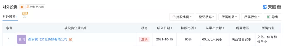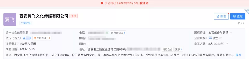翼飞文化还曾投资过【西安翼飞文化传媒有限公司】,不过该公司已于2023年7月被注销。