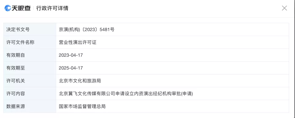 天眼妹看到,翼飞文化曾获得营业性演出许可证,有效期至今年4月17日。