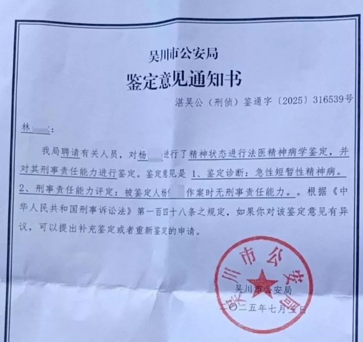 林女士介绍,今年7月3日,警方曾出具鉴定书,杨某某被鉴定为“急性短暂性精神病”,作案时无刑事责任能力。不过,他们一家对鉴定结果并不认同,已向警方申请重新鉴定,第二次鉴定结果尚未出。