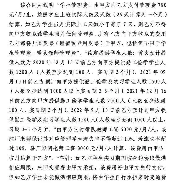 今年9月,陈庆峰在天眼查上,找到了一份关于云南商务职业学院的民事判决书,里面提到带队进厂教师工资每月6000元,若学生流失率超过10%,工资减半。判决书显示,2020年,学院与一家中介签订了《实习生实习就业协议》,约定中介向学院支付保证金 1500 万元,学院则输送实习生参加勤工俭学,独家合作期限5年。