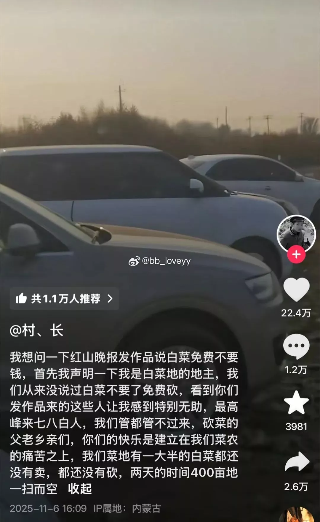 在内蒙古赤峰,一则白菜免费的视频在网上传播,而且当地的官方媒体《红山晚报》还转发了这一则消息。
