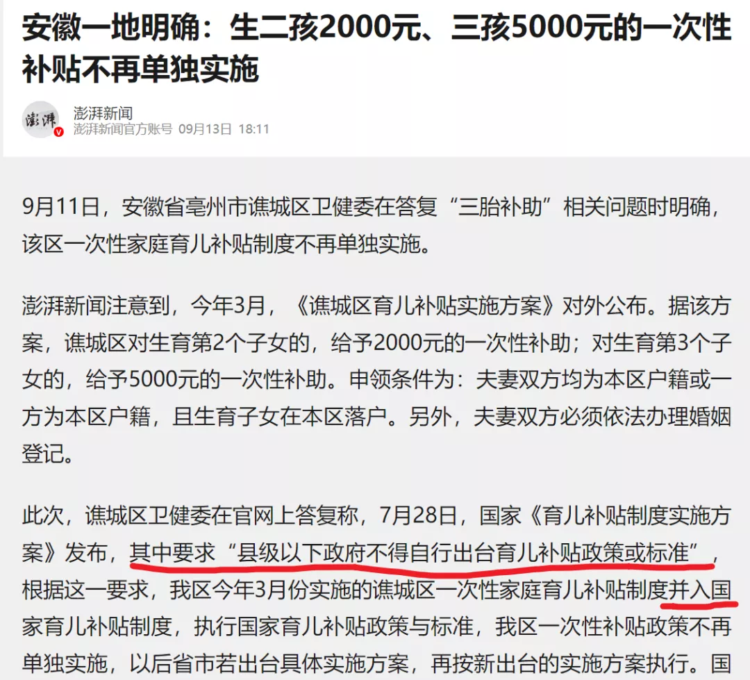 其次,在国家《育儿补贴制度实施方案》发布之后,地方上一些生育补贴政策也就不再单独实施了,因为实施方案中就要求了“县级以下政府不得自行出台育儿补贴政策或标准”。