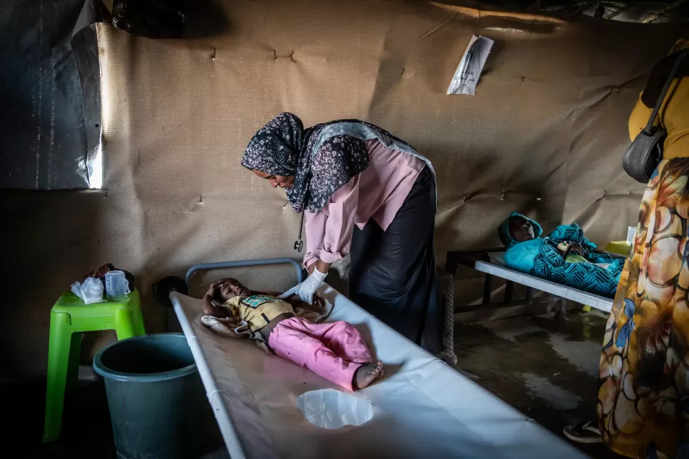 苏丹的一个流离失所者营地中,MSF(无国界医生)霍乱诊所的Dr.Omnayat El Toom正在为一名患有霍乱的儿童患者进行治疗/图源:联合国人道主义事务协调厅