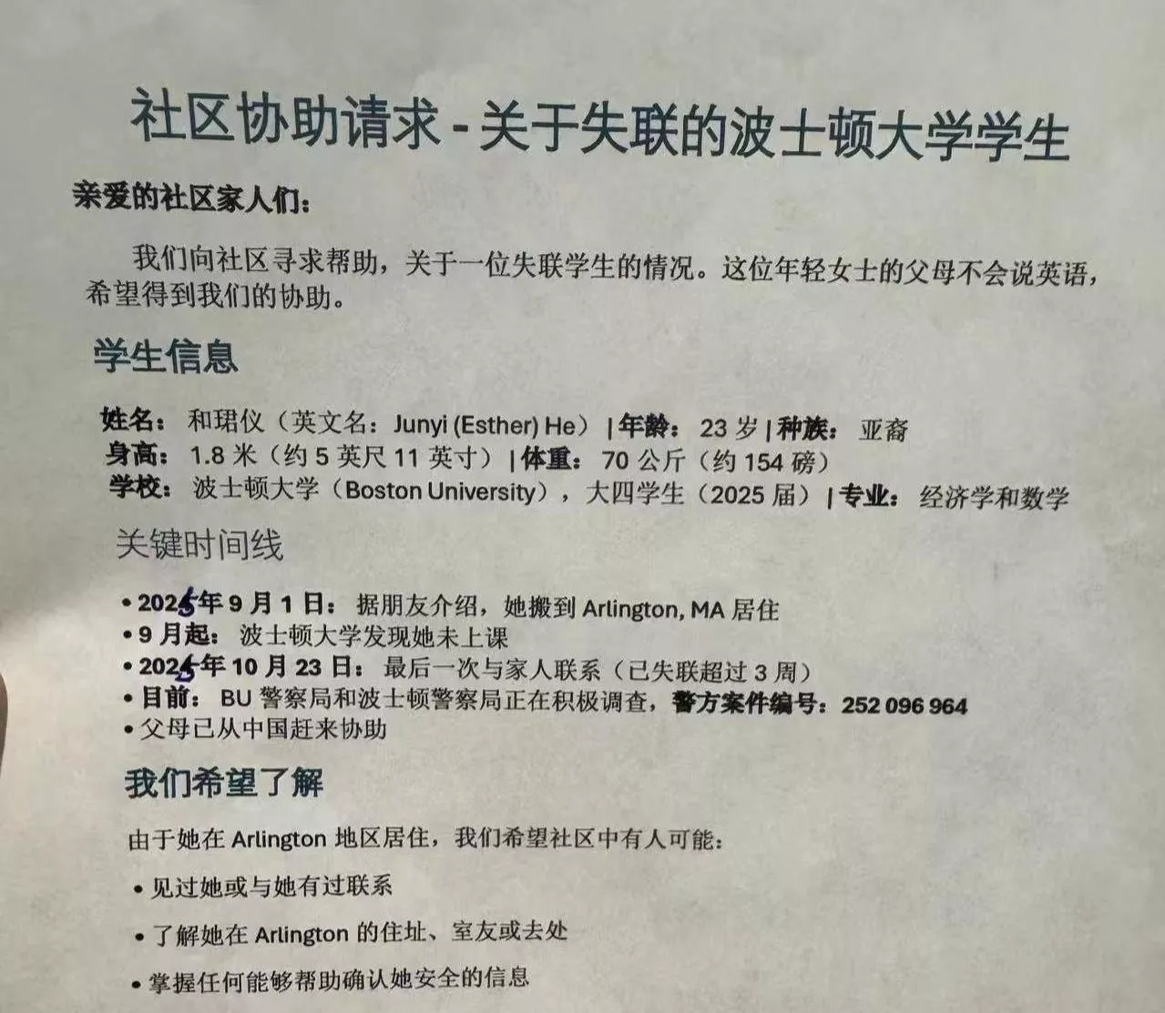 据寻人启事,23岁亚裔女性和珺仪为波士顿大学学生,专业为经济学和数学,身高1米8,体重70公斤。2025年9月1日,据朋友介绍,和珺仪搬到马萨诸塞州的阿灵顿居住。9月起,波士顿大学发现她未到校上课,10月23日为她与家人的最后一次联系,目前已失联超3周。BU警察局和波士顿警察局正在积极调查。和珺仪的父母已从中国赶至美国。