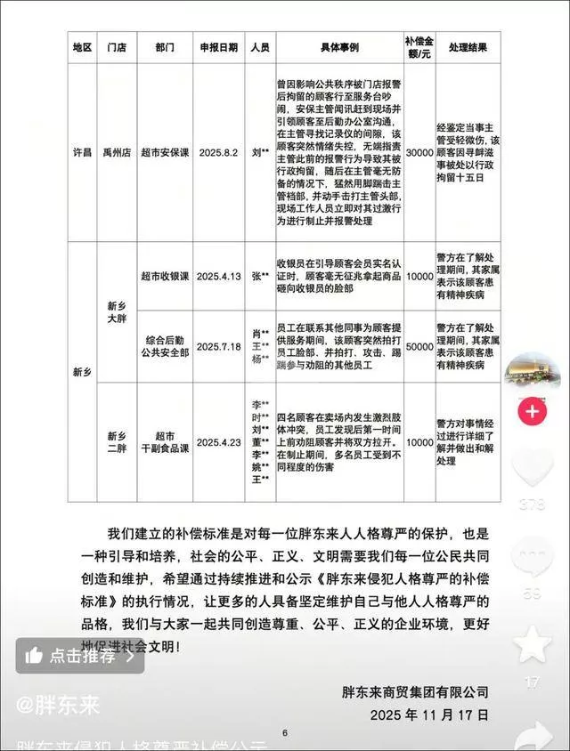 公司通过建立《胖东来侵犯人格尊严的补偿标准》,创造尊重、公平、正义的企业人文环境,同时启迪更多人重视对自己和他人人格尊严的保护,不因为意识淡薄甚至恶意、随意地侵犯、伤害他人,造成严重的精神损失和痛苦!同时,更好地影响和带动更多社会力量和法律体系的完善,保障和维护公民的个人权利!让人们更幸福、让社会更文明、让国家更美好!