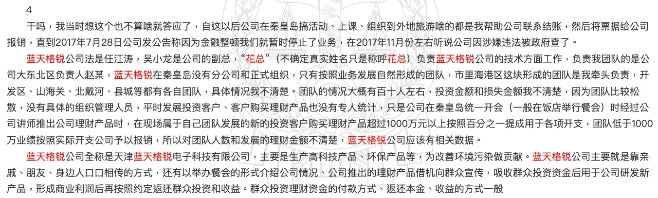 内地“蓝天格锐”案件的判决书,指不知道“花总”真实姓名。(中国裁判文书网)