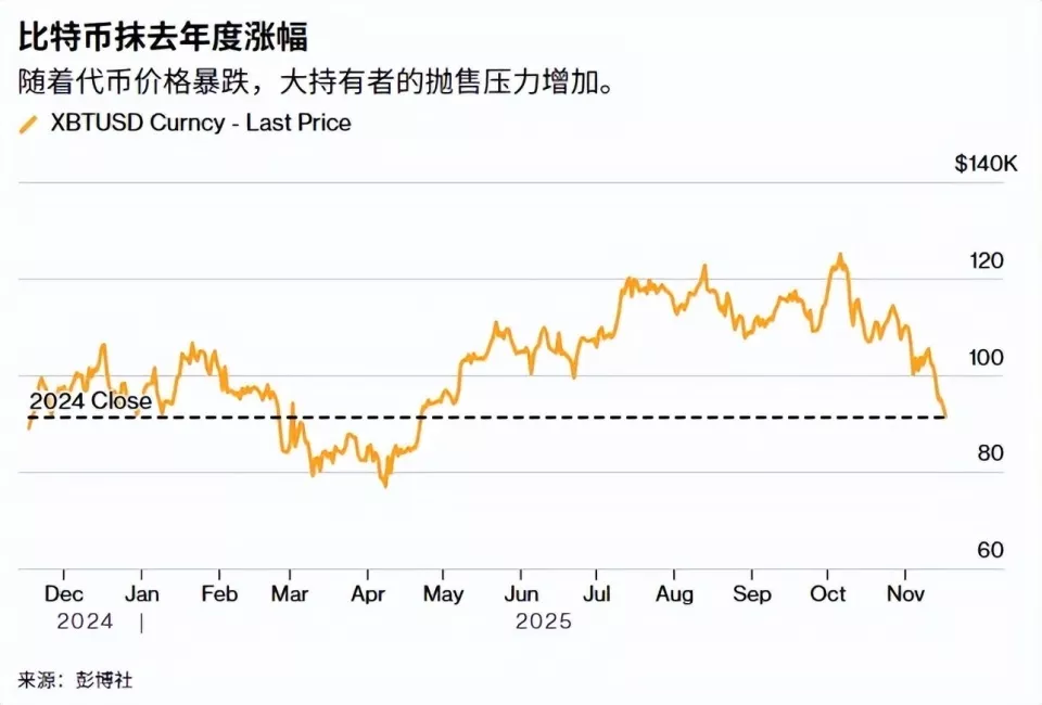 另一大重灾区是加密货币。比特币从10月份的12.6万美元开始下跌,并一度跌破9万美元。