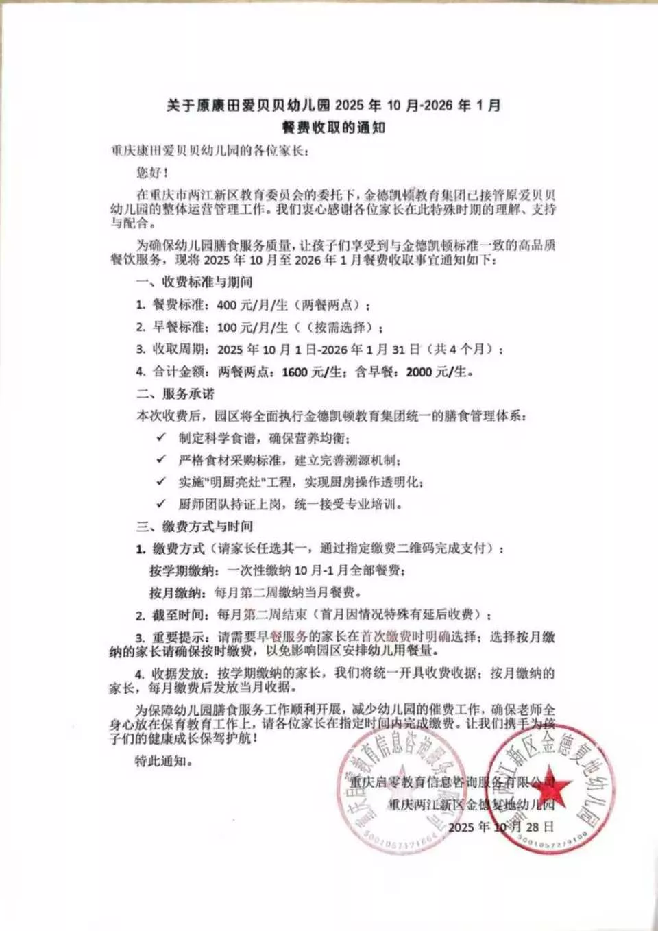 10月底,启零公司决定收取本学期的餐费,该公司发布的通知显示,在教育部门的委托下,“金德凯顿”已接管原“爱贝贝”幼儿园的整体运营管理工作,决定收取2025年10月至2026年1月底的餐费,具体标准为400元/月/生(两餐两点),如另提供早餐,要再交100元/月/生。
