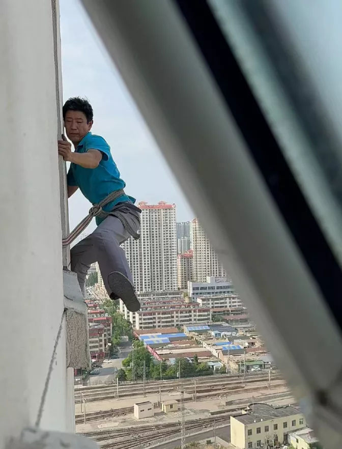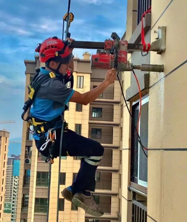 空调工在外墙打上了6颗拉爆螺丝,通过安全绳的拉动外机,就像蜘蛛人一样,看着就怕。