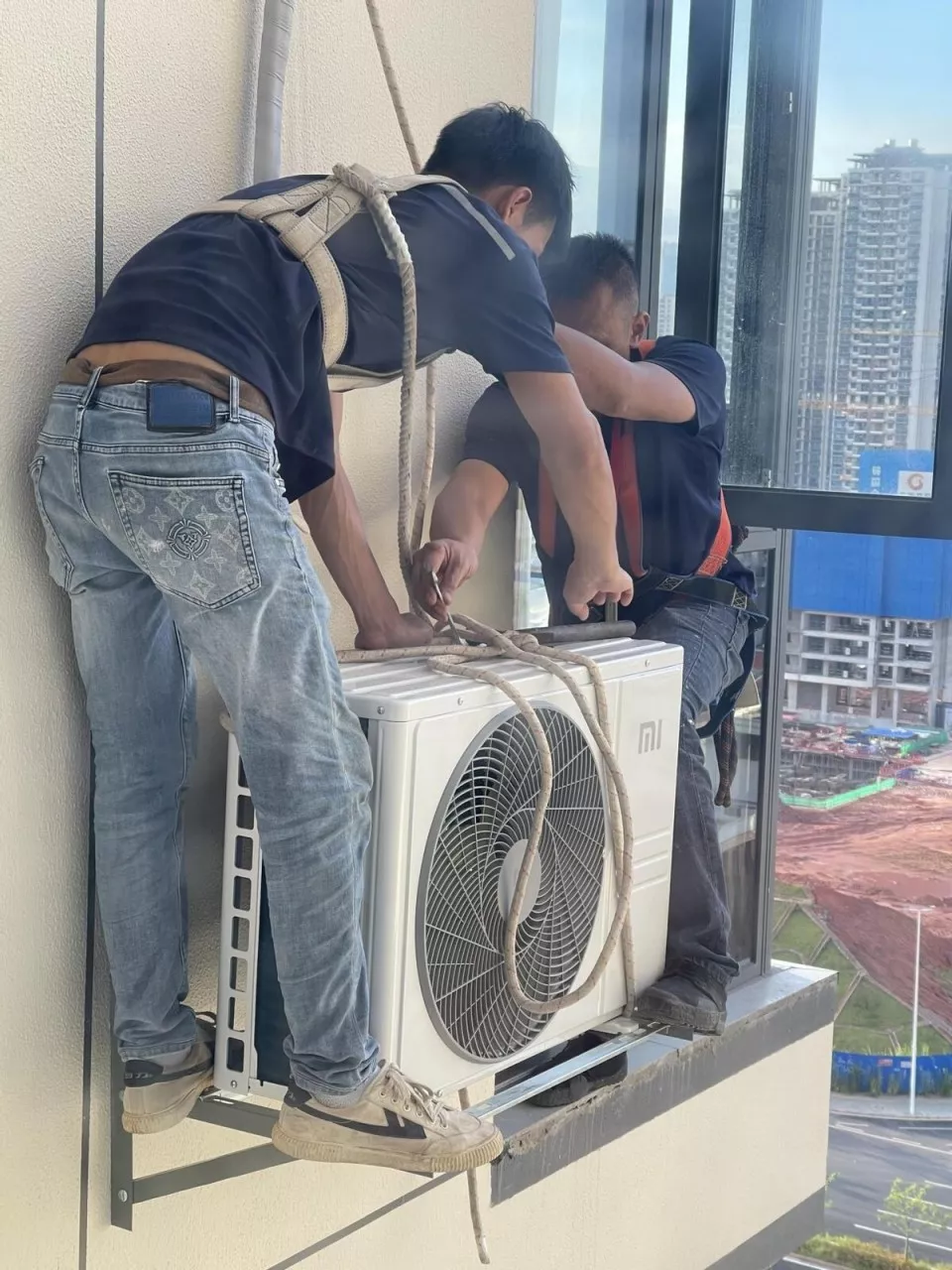 空调机位都位于建筑的外面,安装时只能从附近的窗户爬出外墙,通常是两人配合,一人在室内传递空调外机,一人绑上安全绳进行高空作业。