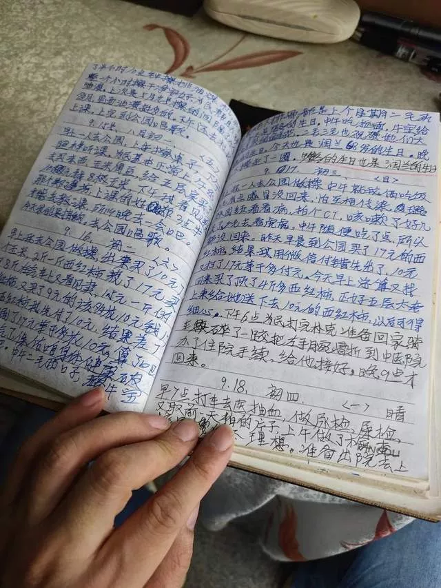 衰老常与遗忘有关,但王春兰用这种方式与时间对抗。她说自己要“争取和老伴一起活到100岁”。绝大部分日记,王春兰记录的都是轻松日常的小事,关乎开销或是儿女。而2023年9月17日的日记,用稍显凌乱且颜色不同的笔迹,记下了少有的意外状况——