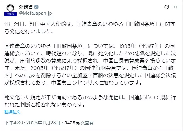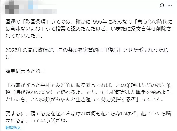 有网民指出,就算“敌国条款”在1995年被认为“不合时宜”,但该条款至今未被删除,并且在2025年被高市政权“激活”了。