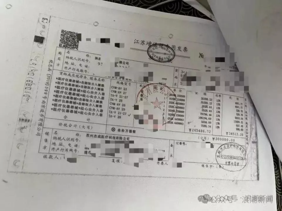 李女士向记者提供了一份《江苏增值税专用发票》。该发票由西安市市场监管综合执法支队在对该案件调查过程中从经销商处调取。医院使用的心脏瓣膜厂家为“苏州杰成医疗科技有限公司”,发票记载显示,供应商为“陕西某商贸有限公司”。2020年11月,“陕西某商贸有限公司”从销售方“苏州杰成医疗科技有限公司”采购7套瓣膜器械,合计26万多元。其中包括医院为李女士父亲做手术使用的瓣膜产品,当中,经心尖介入器,型号规格TAV21-27,单价为2528元;自膨胀介入瓣膜,型号规格CVM-AV25,单价为35398元。