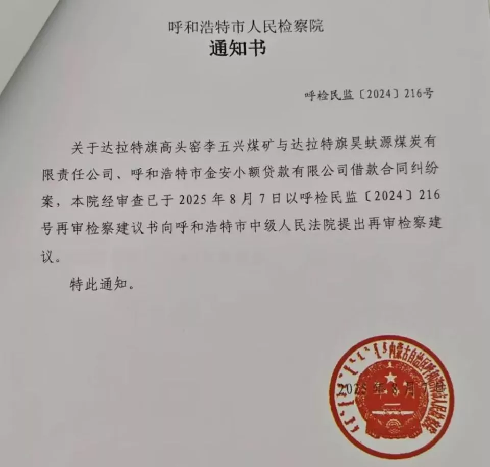 据此,李五兴煤矿针对呼市中院的再审驳回裁定向呼和浩特市人民检察院申请监督。2024年9月19日,呼和浩特市人民检察院决定受理监督申请,并于2025年8月7日出具通知书,告知李五兴煤矿已向呼市中院提出再审检察建议。