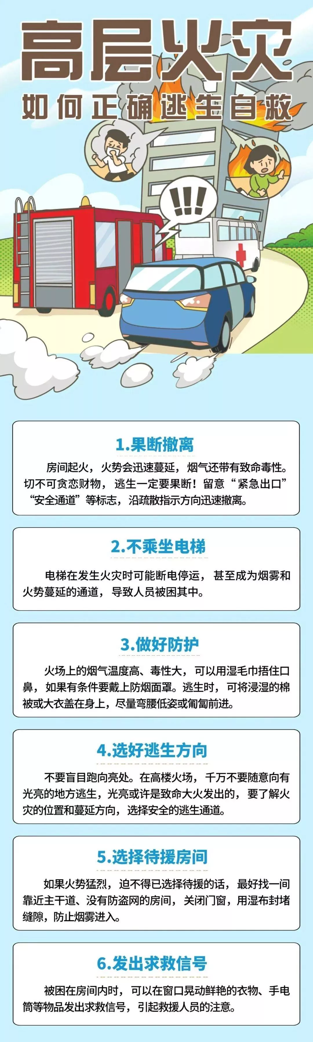 楼上发生火灾:这种情况危险最小,火在上面,人在下面,火势和浓烟被楼板阻隔。只要从楼梯下楼即可,下楼时不要乘坐电梯。