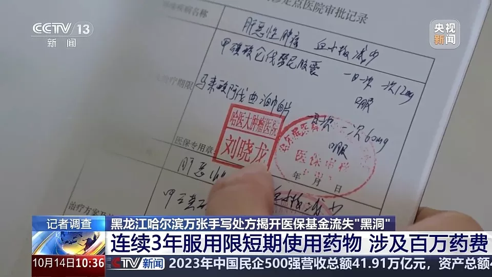 这些手写处方,开具的药品数额单张少则近千元,多则一两万元,这种大额的特殊药品处方,本应管理更加严格,怎么会是手写的呢?检查组注意到,这些手写处方很多标注来自哈尔滨医科大学附属肿瘤医院等医疗机构。那么这些处方是不是从这些医院开具的呢?