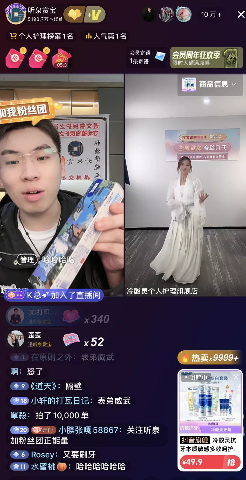 昨日晚间,听泉鉴宝开启改名后的首秀。据飞瓜数据显示,巅峰在线人数超过100万人。和此前单纯鉴宝不同的是,此次直播商业化味道更浓。开播仅仅几分钟,冷酸灵、欧莱雅、蓝月亮、七度空间等各大品牌不断刷礼物霸占打赏榜单。