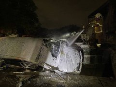 休旅车卡在水沟火烧车,消防员扑灭。(民众提供) 真是千钧一发!台南市西港区后营里今(13日)晚上近10点,一辆休旅车自撞卡道路侧沟后火烧车,48岁女驾驶赶紧爬出车外,无明显...