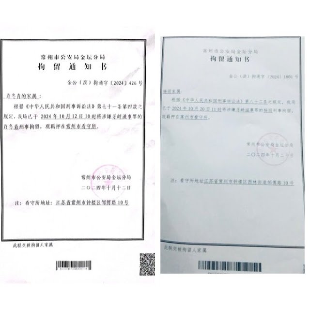 2024年10月12日,许冬青因上访再次被金坛公安刑拘。当日晚上,送达刑事拘留通知书的金坛滨湖派出所副所长翟俊侃称先拘留3日,3日后如何处理由领导开会决定。至今、许冬青依然被拘押在常州看守所中。