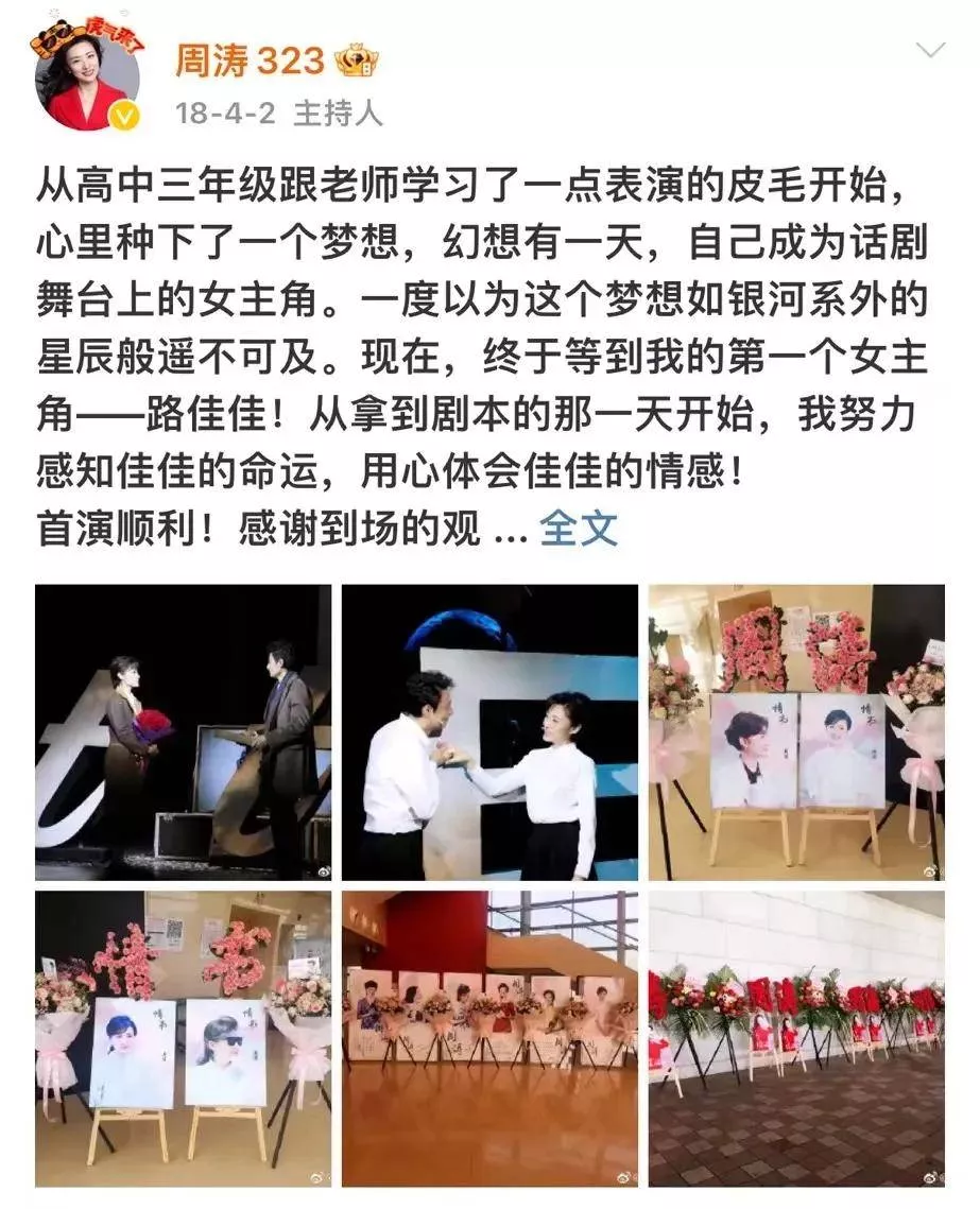 她主演了话剧《情书》,饰演女主角路佳佳。从青春到白头,周涛在舞台上演绎了一个女性的一生。