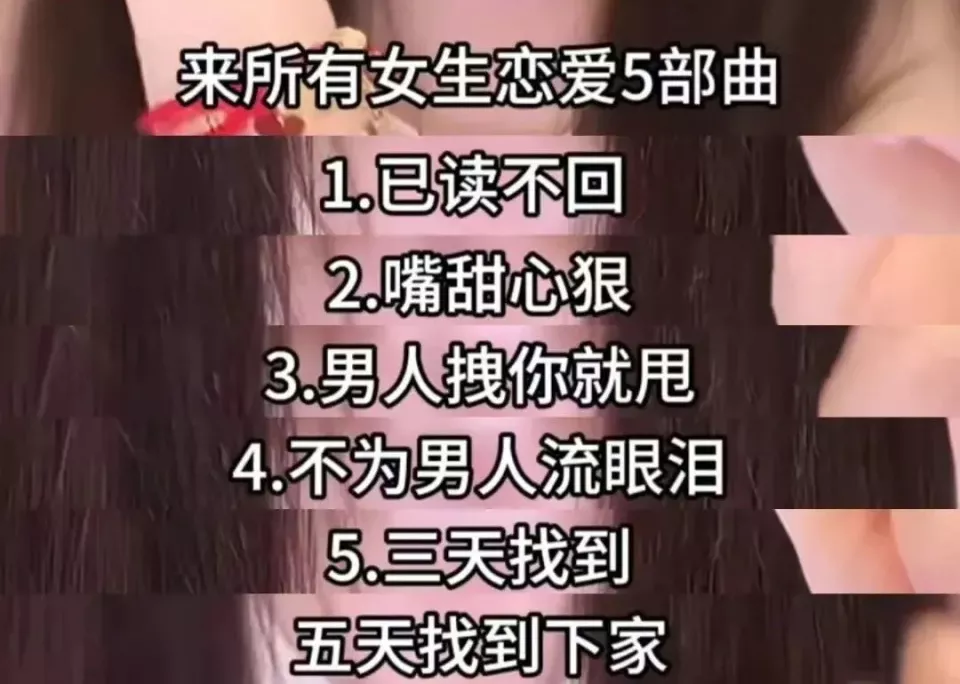 梳理出痛点,迅速给出一套方法论——恋爱女生五部曲,已读不回,嘴甜心狠,男人拽你就甩,不为男人流泪,三天找好下家…