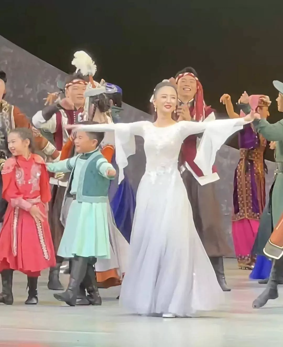 佟丽娅在最后谢幕时,一手牵着小酒窝,一手牵着儿子朵朵,九岁的朵朵穿着一套绿色的民族服饰,看着长高了不少,正脸长相帅气,脸型眉眼像极了爸爸陈思诚,鼻子像佟丽娅,十足的小帅哥。
