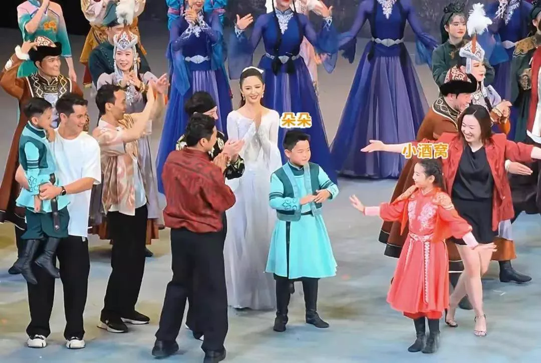 演出现场,朵朵也非常活泼,跟着妈妈佟丽娅还有小酒窝一起载歌载舞,脸部神态真像陈思诚的mini版。