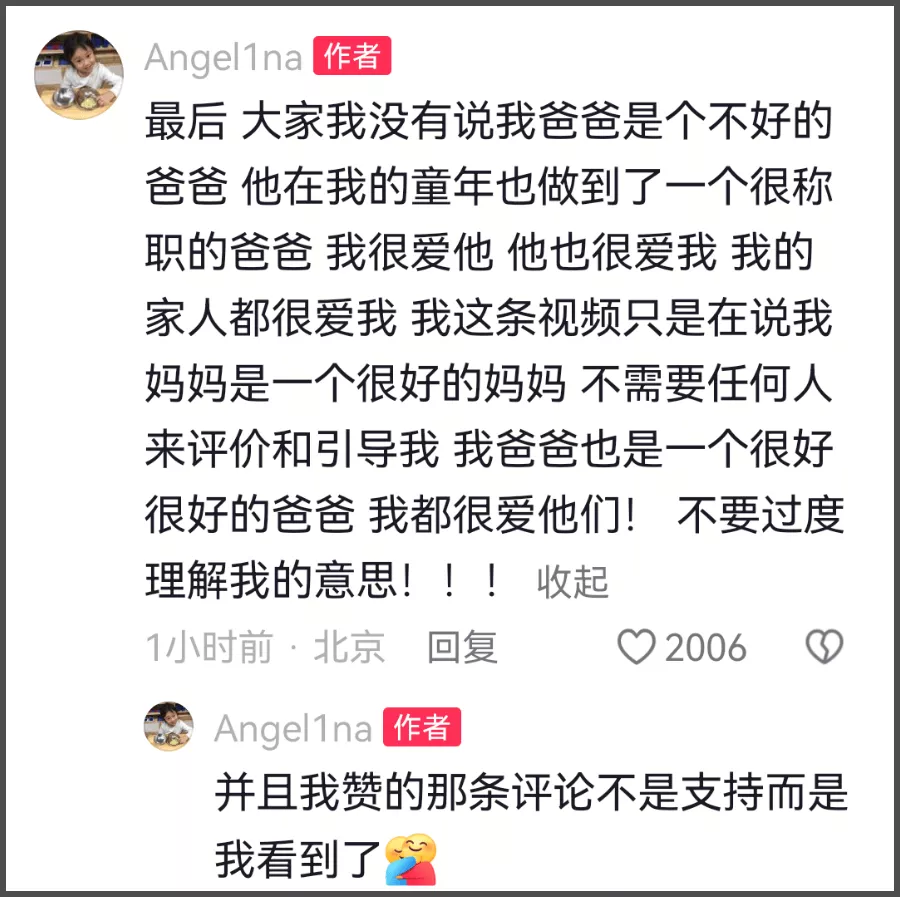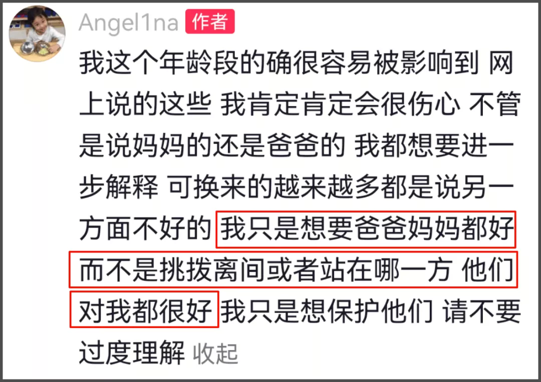 随后,甜馨发文回应表示是外界过度解读,称贾乃亮是一个很称职的爸爸,自己点赞没有什么特别的意思,只表示“看到了”。并表示自己这个年龄段确实会被网上声音影响到,但她只想父母都好,而不是挑拨离间或者站在哪一方,希望大家不要过度解读。