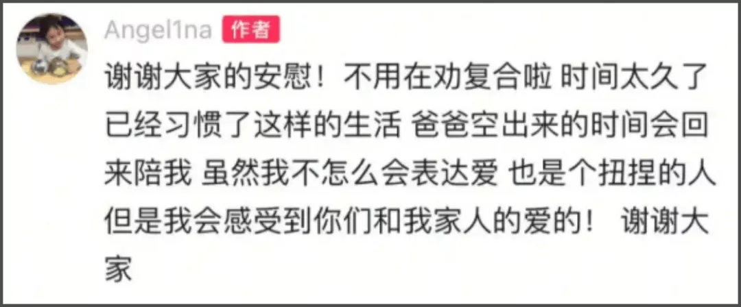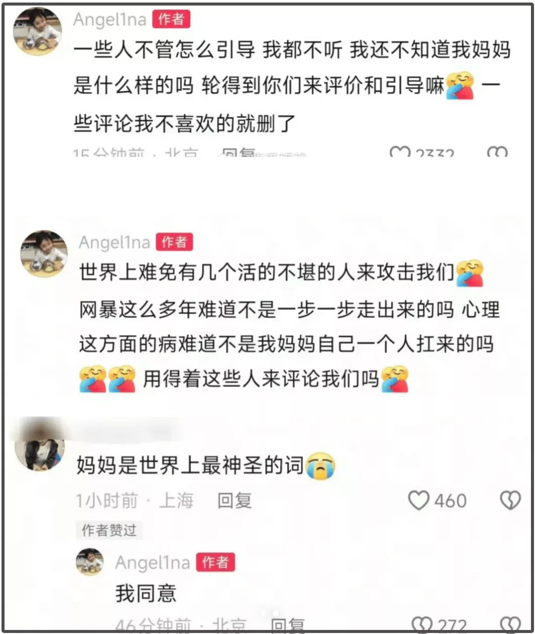 因为李小璐早年做头发风波的原因,部分网友也会在甜馨的评论区恶意攻击带节奏,但她一直都力挺妈妈,表示自己不会听网友的引导,表示“我还不知道我妈妈是什么样的吗”,就连祝贾乃亮父亲节快乐,配文也不忘带上“也爱妈妈”。