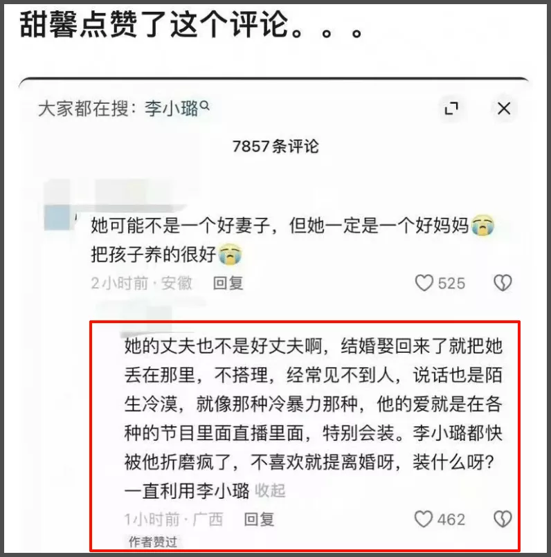 有网友表示李小璐可能不是个好妻子,但她是个好妈妈。随后又有网友吐槽贾乃亮也不是好丈夫,特别会装,爆料他婚内冷暴力,而甜馨则点赞了这条评论,疑似内涵亲爹,事件迅速升级。