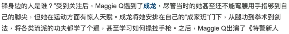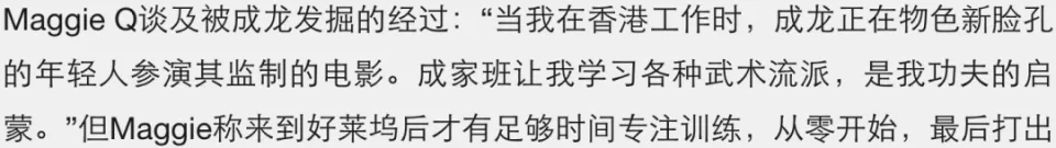 从此,Maggie Q被领进成龙的“成家班”习武,为日后进入影坛做准备。