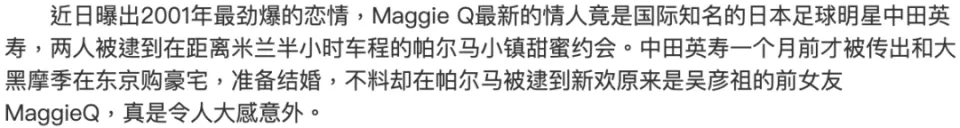 2001年,据说中田英寿在香港通过朋友介绍认识了Maggie Q,当时中田英寿是意甲最有前途的球星,Maggie Q是全港最漂亮的女明星,二人天雷勾动地火,很快就在一起了。