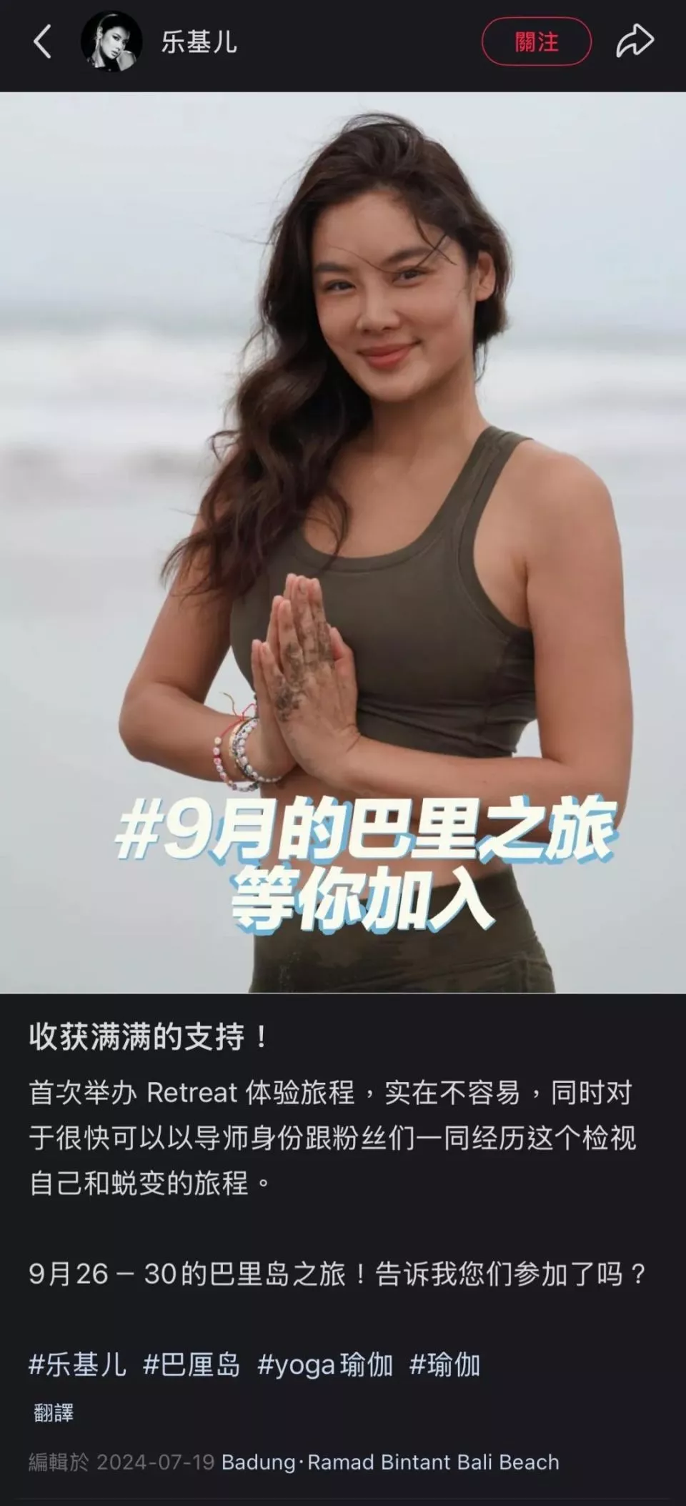 ▲ 和Maggie Q一样,乐基儿也喜欢瑜伽,去年,乐基儿在巴厘岛办瑜伽普拉提静修课程,看起来似乎相当专业。