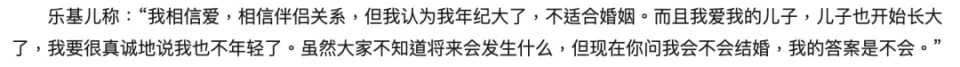 ▲ 2023年9月,乐基儿发布一则ins,声称自己目前是“co-parent(共同抚养)”,算是官宣离婚,之后她在采访中称,“我相信爱,相信伴侣关系,但我年纪大了,不适合婚姻,现在你问我会不会结婚,我的答案是不会。